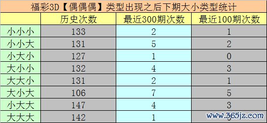 二、最近7次【大大小】奖号之后,其下期分离开出号码:457、626、914、055、411、844、117,其中组三号码出现5次,组六号码出现2次。本期瞻望开出组六号码。